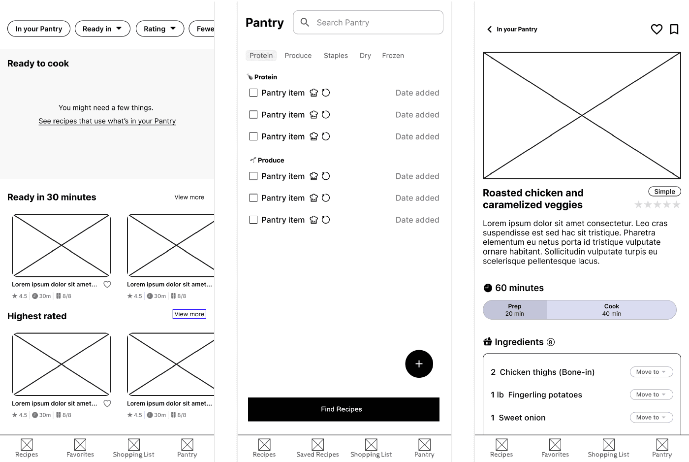 Low fidelity: I began with paper wireframes and low-fidelity digital screens to map the core task flows. Lo-fi allowed me to test structural decisions quickly — where the Pantry lived in the navigation, how receipt confirmation should work, and how recipes would surface pantry-matched ingredients.