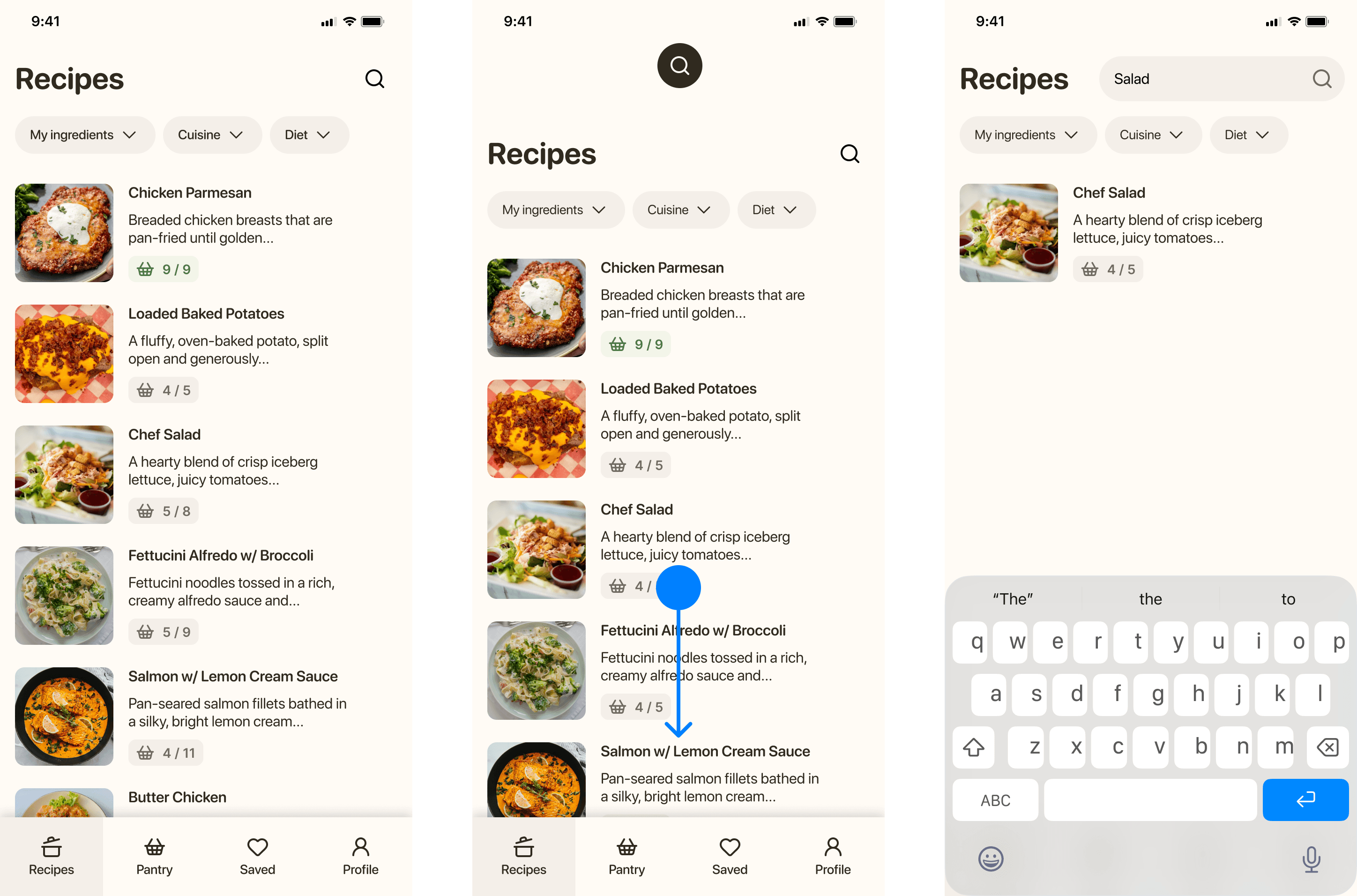 Earlier iterations used horizontal scrolling and featured categories, which pulled toward discovery. The final design is a vertical list, sorted by ingredient match — recipes you can make tonight surface first. Breadbox isn't trying to inspire you, it's trying to get dinner on the table with what's already in the kitchen. Three filters (My Ingredients, Cuisine, Diet) let users narrow from there without adding friction to the default experience. Pulling down opens search by name for users who already know what they want.