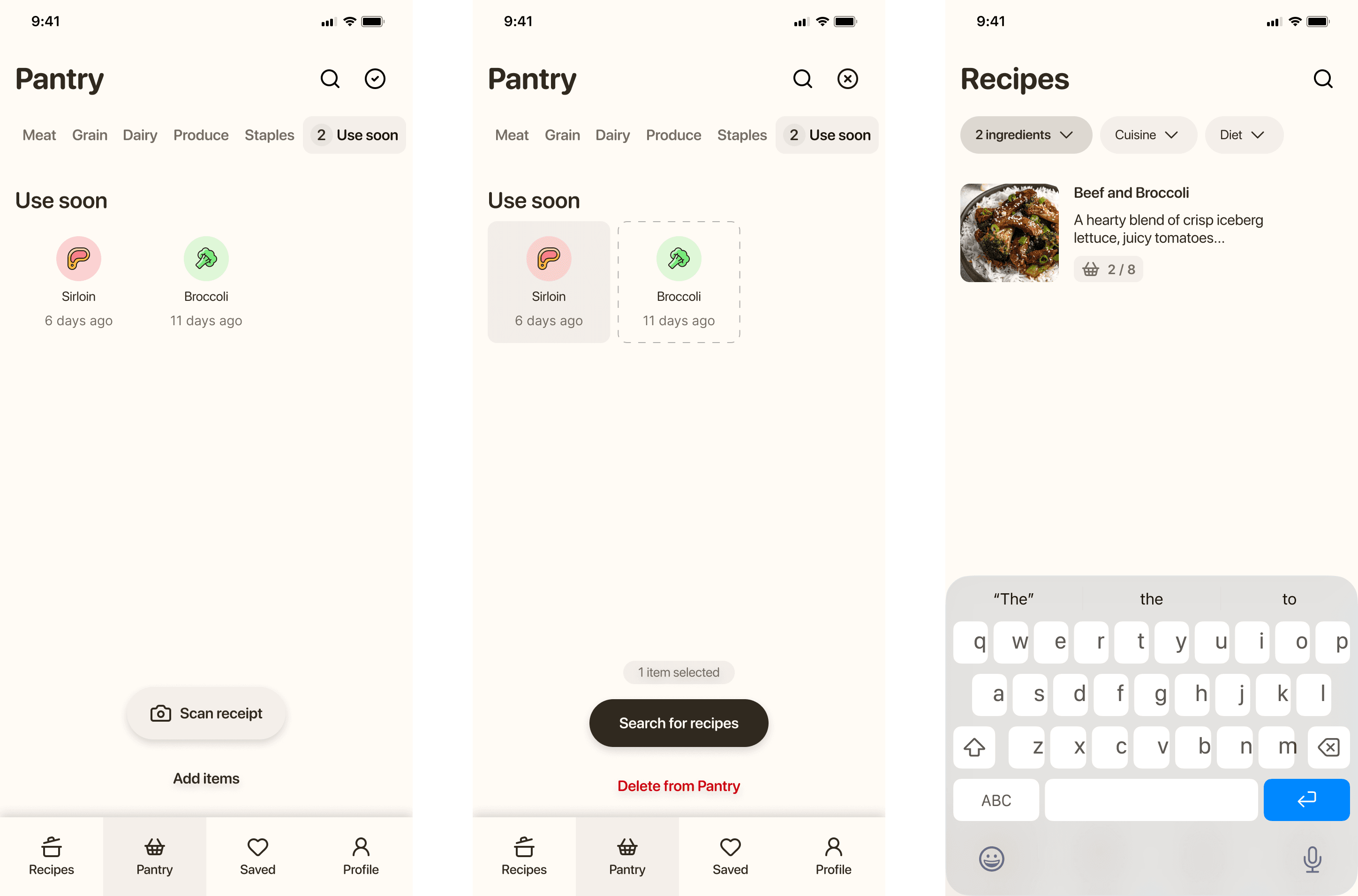 Breadbox is a mobile app concept built for home cooks who want to waste less and stress less. Users scan grocery receipts to populate a Pantry, then search for recipes filtered to what they have on hand. The less users have to think about what's in the fridge, the more likely they are to actually use it.