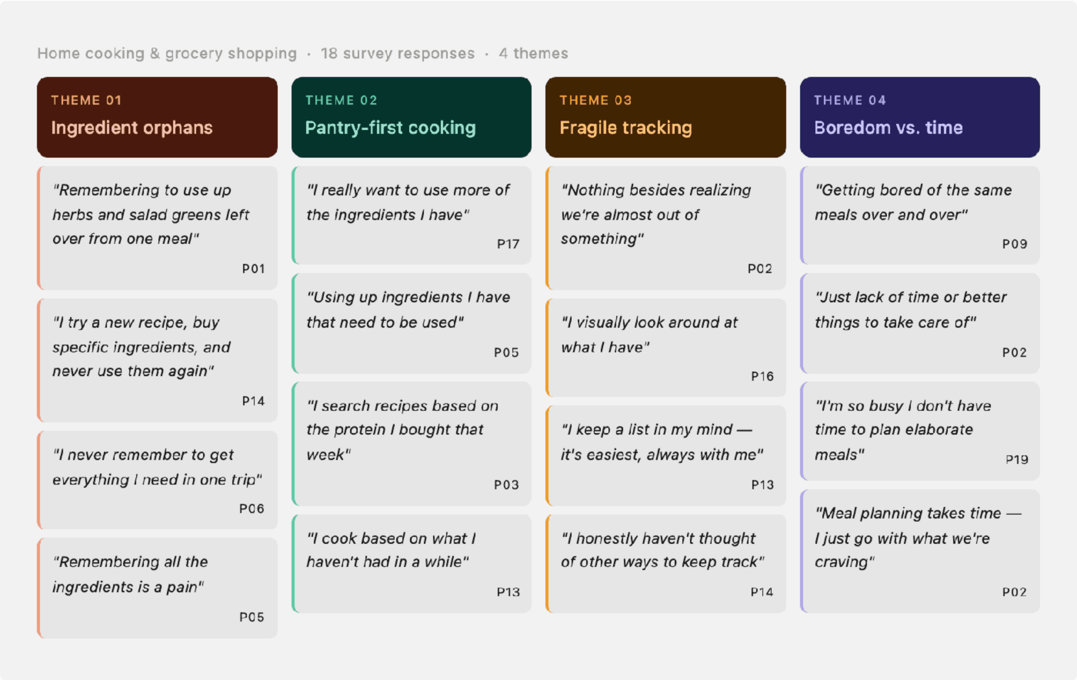 Theme 1: Ingredient orphans cause the most frustration. The most specific, recurring pain point was leftover ingredients from recipes — bought intentionally, used once, then forgotten. As one respondent put it: