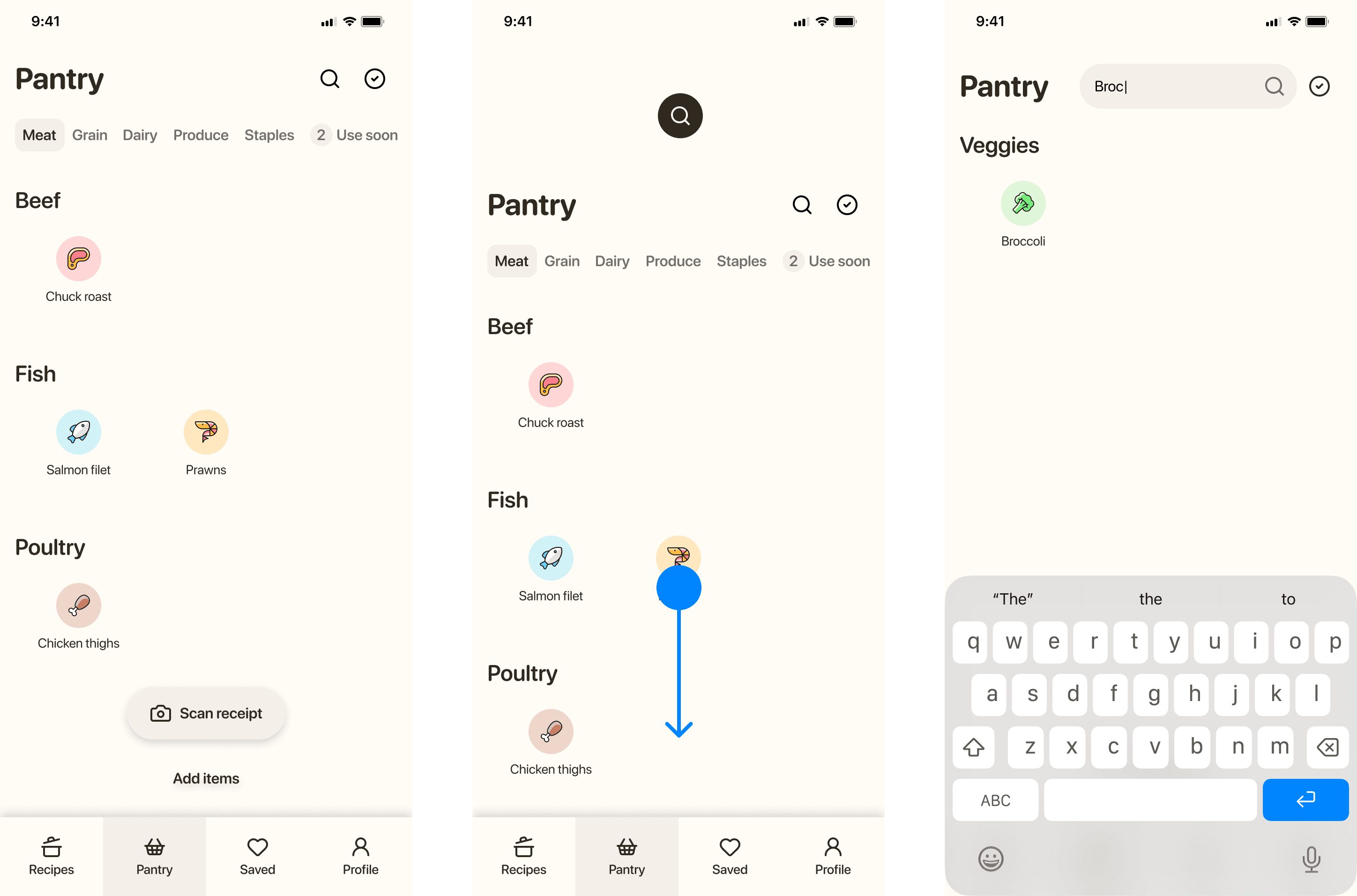 The Pantry is organized around food groups, not an alphabetical dump or a running list. Meat leads because that's how most respondents actually plan — protein first, everything else around it. Food images replace plain text entries, which matters: a pantry that looks like a grocery haul feels usable in a way that a checklist doesn't. Within each tab, subcategory headers keep browsing scannable without requiring search. Swipe down to find a specific ingredient by name, same gesture as Recipes — one less pattern to learn.